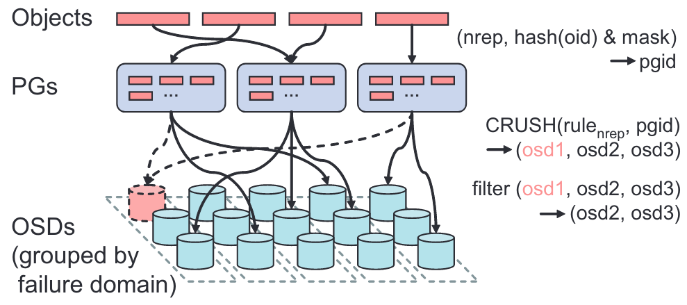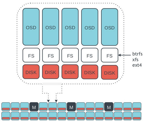 CRUSH répartit équitablement les PG au sein du cluster sur différents OSD. Les OSD sont des machines qui combinent CPU et RAM, interface réseau, un cache local dédié et un disque sous-jacent. Sur ces machines, un démon tourne pour chaque disque présent (OSD : Object Storage Deamon).