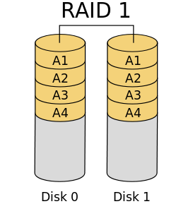 Le RAID 1 est un des plus simple : les données d’un disque sont répliquées sur les autres. Cette méthode nécessite donc au moins 2 disques de taille identique.